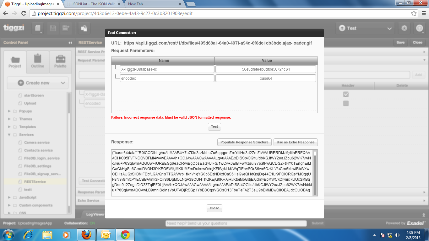 I have upload an image using rest service on tigzzi. Now I want to get this image, when I have test this image in tiggzi using test connection i am getting the inccorect base64 data.