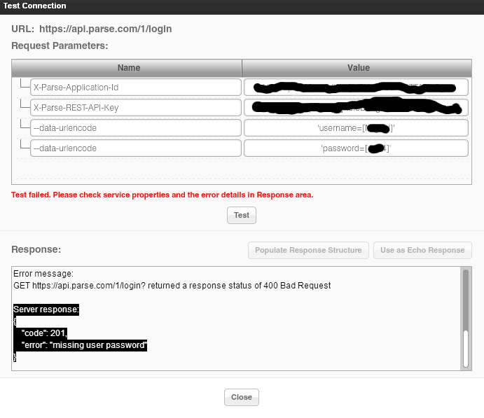 Hi, I heve tried in so many ways to login in parse, but it always return: Server response: { "code": 201, "error": "missing user password" }