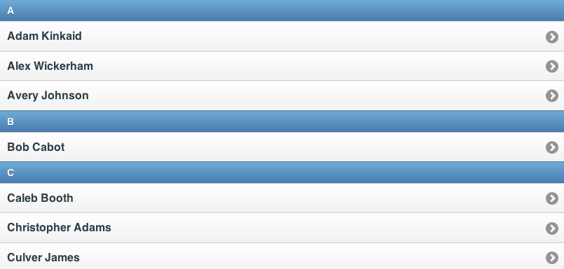 A listview can be configured to automatically generate dividers for its items. This is done by adding a data-autodividers="true" attribute to any listview.
