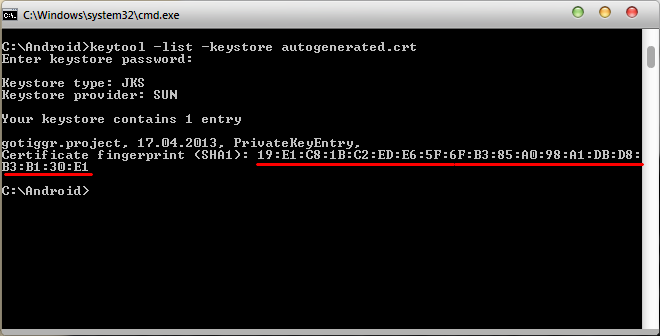 codekeytool -list -keystore autogenerated.crt/codeand enter the certificate key.