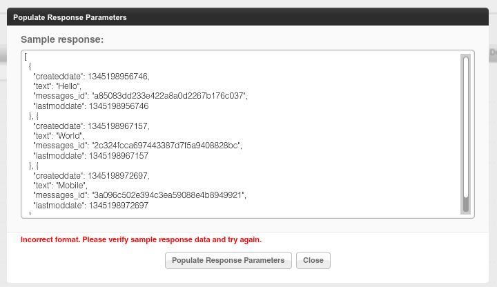 Take the JSON response and enter it into: http://jsonlint.com/. It's valid and it will also format it. Copy the response and use in Tiggzi -- it seems to work.