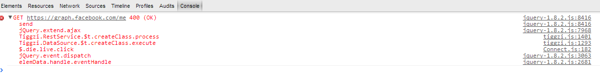 The error in Chrome (on screenshot) appears because "Log In" button click invokes Rest Service GetData. This is incorrect. GetData service should be invoked only after FB logging in.