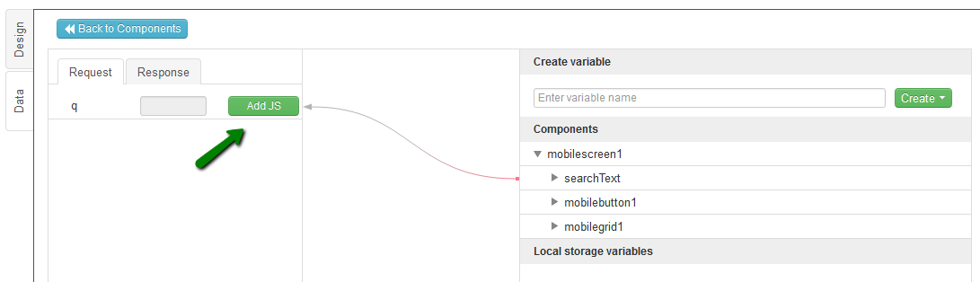 If I do this it obviously wont work but It might explain what I am trying to achieve. I am building the two variables from two local storage variables then attempting to pass these into the service request. I want to save the results to another local storage variable.