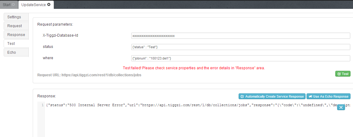 1) You have incorrect service URL. It should be https://api.tiggzi.com/rest/1/db/coll... (object_id is a request parameter).