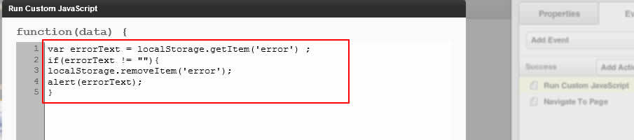 The easiest way is to map Service to localStorage as shown here http://help.gotiggr.com/documentation.... The main idea is to save Error into localStorage and then get it with JS. Please try to run this JS on Service success event: