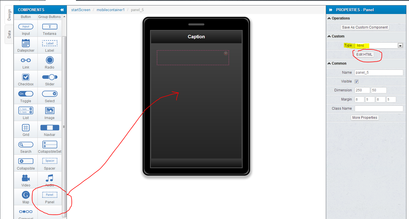 You're able to use HTML code in Panel component. Just drag it to screen, set type=html and edit your code.