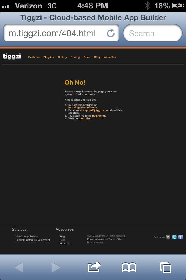 I scanned it both in the app page and the test page. The page that comes up is the 'Oh No!' page - m.tiggzi.404.html, according to Safari