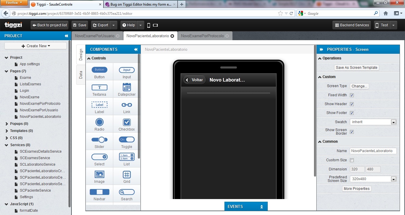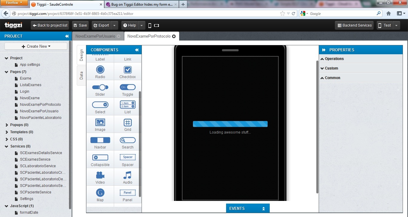 I'm having a bug on tiggzi editor. My account is pedro.cavalero@gmail.com and i have one project, SaudeControle. I have two screens, NovoExamePorProtocolo and NovoPacienteLaboratorio that i cant see the form elements to edit. All the mapping and events are there but the elements are gone, and i cant edit it. What can I do?
