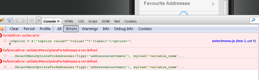 I have the following errors, the syntax error on app opening, and the js errors when I try to open addresses screen, I can share app if it helps