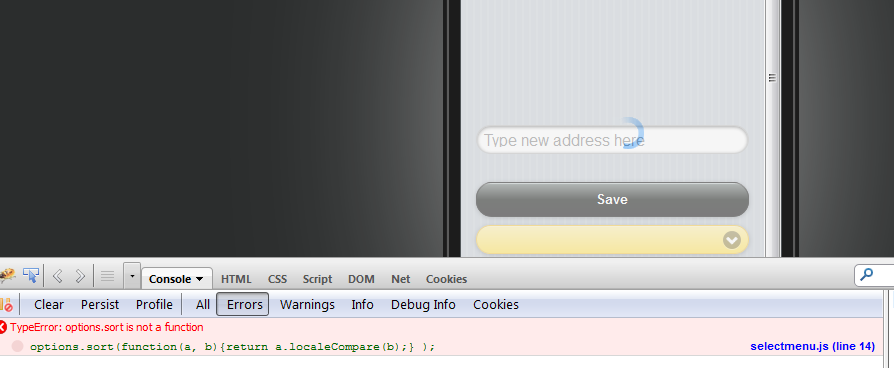 Please, open JS asset "selectmenu" and check if there are any errors somewhere about the line: